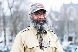 ![]() Filep Karma wearing his East Timorese hat and West Papuan flag as his clothing pin. | |