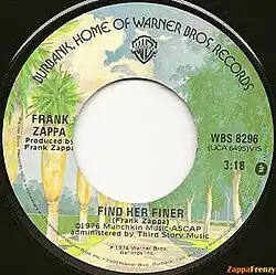 "Find Her Finer" is a 1976 single by Frank Zappa from the album Zoot Allures. The song was recorded with Zappa's lips extremely close to the microphone, creating an intimate sound.[1] Roy Estrada provided falsetto vocals to create a comic effect to the song. It was intended to be the lead single for Zoot Allures, but failed to chart, unlike its other single "Disco Boy".[2] A live and sped up jazz version can also be found on the album The Best Band You Never Heard in Your Life. It was played in concert in 1976 and 1988.[3]
