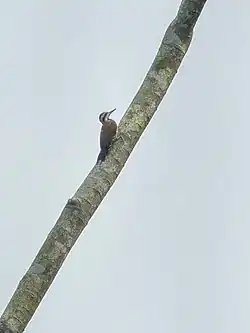 This woodpecker is usually seen in pairs or small family groups, but it sometimes associates with other insect-eating birds. It forages for insects, especially beetle larvae, mainly in the canopy and on dead standing trees, but sometimes descends onto fallen trees. Both sexes drum in the dry season in repeated, short rapid bursts, at the rate of 14 to 38 strikes per second.[2]