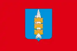 The flag of Krasnoyarsk Krai, in the Russian Federation, is a red field charged with the krai's coat of arms in the center. Two fifths of the flag's height, it displays a golden lion holding a sickle in its left hand and a shovel in its right hand. The lion is surrounded by a golden wreath of cedar and oak leaves as well as a light blue ribbon on the left, right, and bottom sides. A golden pedestal encloses the lion at the top. The flag was adopted on 16 March 2000.