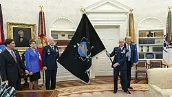 The Space Force flag is a black field, with the official flag fringed in platinum. The flag is derived from the central and supporting elements of the Space Force seal, including the delta wing, globe, elliptical orbit, Polaris star, and star clusters. Beneath the central imagery "UNITED STATES SPACE FORCE" and the year 2019 in Roman numerals in white lettering, indicating the name and birth year of the service.[1]