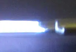 Simmer-voltage triggering is the least common method. In this technique, the capacitor voltage is not initially applied to the electrodes, but instead, a high voltage spark streamer is maintained between the electrodes. The high current from the capacitor is delivered to the electrodes using a thyristor or a spark gap. This type of triggering is used mainly in very fast rise time systems, typically those that discharge in the microsecond regime, such as used in high-speed, stop-motion photography or dye lasers. The simmering spark-streamer causes the arc to develop in the exact center of the lamp, increasing the lifetime dramatically.[3] If external triggering is used for extremely short pulses, the spark streamers may still be in contact with the glass when the full current-load passes through the tube, causing wall ablation, or in extreme cases, cracking or even explosion of the lamp. However, because very short pulses often call for very high voltage and low capacitance, to keep the current density from rising too high, some microsecond flashtubes are triggered by simply "over-volting", that is, by applying a voltage to the electrodes which is much higher than the lamp's self-flash threshold, using a spark gap. Often, a combination of simmer voltage and over-volting is used.[1]