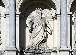 The iconography of the sculptures beneath the arches mingles a biblical and political motifs. The central arch featured a large statue of Moses, made in 1588 by Leonardo Sormani and Prospero da Brescia. The pope, as both religious and political ruler of the papal states, would have felt an affinity to Moses. The left bas-relief panel, sometimes referred to as a depiction of Aaron, and sculpted by Giovanni Battista della Porta,[6] may instead reflect either the miracles by Moses at Marah, where Moses removed the bitterness of the barely potable water of a spring in Sinai, or more likely the miracle at Masah and Meribah, where he struck the rock to cause water to flow (Exodus 17:5-7). Again, the pope would have wanted his achievement of bringing water to Rome to be compared to that of Moses. Finally, the bas-relief to the right sculpted by Flaminio Vacca and Pietro Paolo Olivieri, has been depicted as Joshua, but others claim the relief references Gideon in Judges 7:5, as evidenced by soldier's gear and animals lapping water.[7][8][6] Alternatively, given the Roman attire of the soldiers, it may reflect the founding of the ancient Roman Acqua Alessandrina by emperor Septimius Severus; the imagery would lead to having the feat of the aqueduct being compared to the achievements of ancient Rome, or as an example of the restoration of the former glory of the city. Water flows from the statues into basins, where four lions, originally Ancient Egyptian sculptures, but now copies, once were part of a monumental fountain dedicated to Marcus Agrippa in front of the Roman Pantheon, are spouting water. The columns flanking the arches are also said to have derived from that structure.[9]