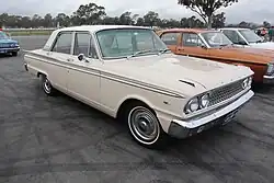 The 1964 US Fairlane 500 sedan was assembled by Ford Australia from December 1963 as the FD model.[12] It was introduced in April 1964, distinguished by a lack of tail fins[10] and a new grille with seven vertical bars.[13] A choice of two powertrains was offered in the new model, a 260-cubic-inch (4.3 L) Windsor V8 with Ford-O-Matic automatic transmission or a 289-cubic-inch (4.74 L) Windsor V8 with Cruise-O-Matic automatic transmission.[10] The 1964 model was the last of the US Fairlanes in Australia, as Ford discontinued the model locally in 1965 to make way for the larger Ford Galaxie;[10] 1,344 examples were produced in Australia.[9]