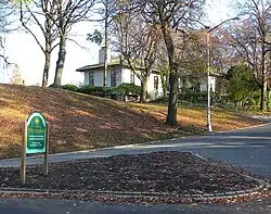 When the park was established, the westernmost portion, about 200 feet (61 m) east of the western border, had a plateau measuring several hundred feet across. The park's two main roads, Forest Park Drive and Forest Parkway, intersect on this plateau.[13] Near this intersection, across from Oak Ridge, is a grove of trees that was planted in 1919 in memory of Queens residents who had died fighting in World War I.[49][48] There were originally 53 trees, but the grove was expanded over the years to 70 trees; there is a plaque nearby with the names of residents who died during the war.[49] Until the 1930s, the Woodhaven neighborhood's annual Memorial Day parades ended outside this grove.[49][48]