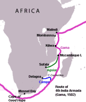 Late June, 1502 – Vasco da Gama makes arrangements to leave Mozambique. A Portuguese factory is established on Mozambique Island, with Gonçalo Baixo as the factor, with some ten assistants, to capitalize on the results of the Sofala trade mission.[49] The new caravel finished, Gama christens it Pomposa and places it, together with some 30 crew, under the command of João Serrão (of future Magellan fame), with instructions to take any goods from the Sofalese trade.[50] According to Correia, Gama was unwilling to wait around for the results of Aguiar's mission to Sofala, and set sail out of Mozambique before Aguiar's returned from Sofala. As a result, Aguiar was forced to leave the Sofalese ambassador in Mozambique (letting him find his own way back home) and set sail for Malindi, hoping to catch Gama there.[51]
