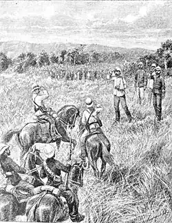 General de Négrier began to concentrate his brigade. The column was moving forward slowly, in single file, and as he watched it he remarked to us, 'The thing about warfare is that you have to learn to be patient.' No sooner were the words out of his mouth than a cannon bogged down. He spurred towards the wretched gun section. 'Oh, for God's sake! Keep the damned thing moving!' Then he burst out laughing, and that set us all off.[7]