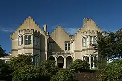 "Castlamore", Lovelock Avenue, Dunedin, designed by F. W. Petre. This Gothic house, with crow stepped gables, hints at a castlelike Scottish baronial theme, but has none of the Gothic gloom and sobriety of the small lancet windows and turrets often associated with the style.