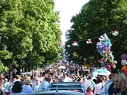 Since 2006, Francuska Street has been the main venue for events during the Saska Kępa Festival.[18] In 2010, it underwent a major renovation. The surface, sidewalks, parking spaces, and bus stops were all replaced, and separate lanes for turning into subordinate streets were designated. On 22 December 2010, pre-Christmas illuminations were inaugurated.[19] In 2011, plaques commemorating the barricade from the September 1939 battles were unveiled.[20]