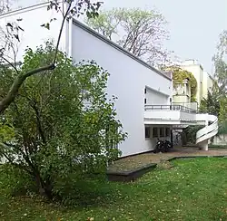 2 Francuska StreetHouse at 2 Francuska Street – the Łepkowski villa from 1933 to 1934 designed by Lucjan Korngold and Piotr Maria Lubiński. Its most characteristic features are on the garden side, including a spacious terrace accessible via winding stairs.[25] From the beginning, the building received favorable reviews and was cited as an example of Le Corbusier's ideas.[26] It is considered one of the most valuable functionalist landmarks in Saska Kępa.[27]