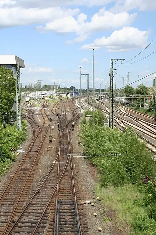 Frankfurt-Höchst Farbwerke station is a station in the district of Höchst of the city of Frankfurt in the German state of Hesse on the Main-Lahn Railway. It is now served by lines S1 and S 2 of the Rhine-Main S-Bahn. The station is classified by Deutsche Bahn as a category 5 station.[1] Although the city of Höchst was incorporated in Frankfurt in 1928, the official name of the station from its opening in 1967 was Farbwerke Hoechst ("Hoechst dye works"), but since the closure of the dye works, the station has been renamed Frankfurt-Höchst Farbwerke.