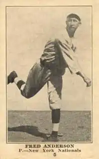 John Frederick Anderson (December 11, 1885 – November 8, 1957) was an American baseball player. He played for Davidson College in 1906, but later transferred to the Maryland Agricultural College (later the University of Maryland), where he played from 1907 to 1909. Then, the 6 ft 2 in (1.88 m), 180-pound pitcher moved to play for the Boston Red Sox. Anderson played in Boston in 1909 but did not play major league baseball again for the Red Sox again until due to his practicing dentistry.[1] In 1914, he jumped to the Federal League to play for Buffalo for the 1914 and 1915 seasons.