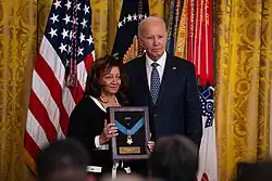 President Joe Biden with Victoria F. Secrest after presenting her the Medal of Honor for her father, former U.S. Army Cpl. Fred B. McGee