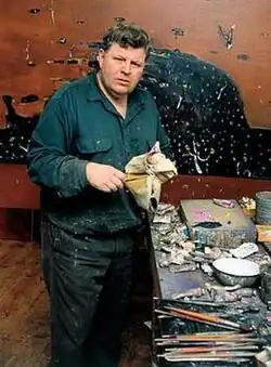 ![]() Fred Williams in front of Gorge landscape (oil on canvas, 1981) from the Pilbara series (photo by Rennie Ellis, 1981) | |