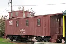 | Chicago Burlington & Quincy Railroad (CB&Q) Wooden Caboose | # 14140 | 1884 | 1958 | Office and car for the train attendants |