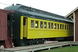 | Built at St. Louis Car Company in 1884 as a part of an order for ten short sixty foot coaches for the "Cowboy Line" of the C&NW being built at the time through Douglas to Lander, Wyoming. It was rebuilt in 1915 by American Car and Foundry Company at Jeffersonville, Indiana when it had steel sheathing installed over the wooden siding and electric lights replaced the gas lights. The coach operated on the North Western Ltd., Victory, Corn King, Viking and Black Hills Express. In 1932 it was assigned to suburban service in the Chicago area where it continued in operation until 1961.[5] | ![]() | |||