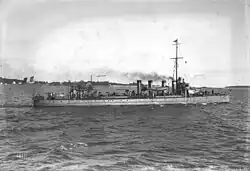 Chasseur was ordered from Chantiers et Ateliers Augustin Normand and was launched from its Le Havre shipyard on 20 February 1909. The ship was completed in November 1909.[4] When the First World War began in August 1914, Chasseur was assigned to the 3rd Destroyer Flotilla (3e escadrille de torpilleurs) of the 1st Naval Army (1ère Armée Navale).[Note 1] During the preliminary stages of the Battle of Antivari on 16 August, the 1st, 4th and 5th Destroyer Flotillas were tasked to escort the core of the 1st Naval Army while the 2nd, 3rd and 6th Flotillas escorted the armored cruisers of the 2nd Light Squadron (2e escadre légère) and two British cruisers. After reuniting both groups and spotting the Austro-Hungarian protected cruiser SMS Zenta and the destroyer SMS Ulan, the French destroyers played no role in sinking the cruiser, although the 4th Flotilla was sent on an unsuccessful pursuit of Ulan. Having broken the Austro-Hungarian blockade of Antivari (now known as Bar), Vice-Admiral (Vice-amiral) Augustin Boué de Lapeyrère, commander of the 1st Naval Army, decided to ferry troops and supplies to the port, escorted by the 2nd Light Squadron and the 1st and 6th Destroyer Flotillas while the rest of the 1st Naval Army bombarded the Austro-Hungarian naval base at Cattaro, Montenegro, on 1 September. Four days later, the fleet covered the evacuation of Danilo, Crown Prince of Montenegro to the Greek island of Corfu. The flotilla escorted multiple small convoys loaded with supplies and equipment to Antivari, beginning in October and lasting for the rest of the year, always covered by the larger ships of the Naval Army in futile attempts to lure the Austro-Hungarian fleet into battle.[6]