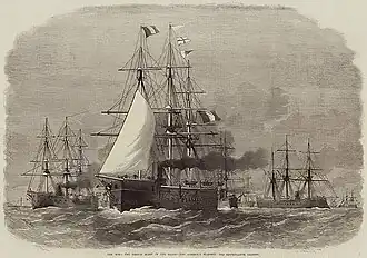 When the Franco-Prussian War began on 19 July 1870, the ship was mobilized and became the flagship of Vice Admiral (vice-amiral) Édouard Bouët-Willaumez's squadron that was tasked to blockade German ports in the Heligoland Bight. It departed Cherbourg on 24 July and, failing to find any German ships, proceeded to Danish waters to wait for further instructions. Bouët-Williaumez was ordered on 2 August to split his forces with half, including Surveillante, proceeding into the Baltic Sea to blockade the Prussian ports there under his command and the others to return to the Bight. On 22 August the Prussian unarmored corvette SMS Nymphe approached the anchored squadron in the Bay of Puck off Danzig (modern Gdansk, Poland) and fired two broadsides at the flagship at long range without result before she was chased off. The strong Prussian coastal defenses prevented any attack by the French ships, but their presence severely inhibited German shipping. Bouët-Willaumez was ordered to return to Cherbourg on 16 September where his squadron joined the ships blockading the Bight after their arrival on the 29th. By then the Prussians were besieging Paris and many of the trained gunners aboard the squadron were transferred to the city. The squadron resumed the blockade with reduced crews until December when smaller ships took it over. Surveillante lost her rudder during a storm on 12 October and had to be towed back to Cherbourg by her sister Guyenne. Bouët-Willaumez became sick a week later and had to haul down his flag.[8]