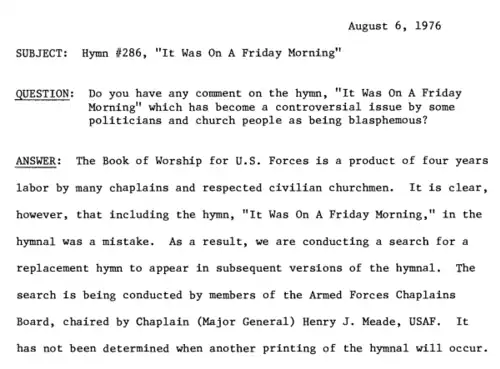 Over the course of the controversy, the Department of Defense received 15,000 letters objecting to "It Was on a Friday Morning", including from at least 49 members of Congress.[19] An October 1976 article in The Saturday Evening Post quipped that the song was "almost as explicit as Matthew, Mark and Luke" and suggested that "if Congress is concerned with morality, Congressmen should start with themselves".[33] Carter said that until he was told his song was being removed, "I didn't even know it was there".[34] Speaking in 1978, Meade said he had been "absolutely correct" to resist political pressure to excise the hymn.[19] In 1993, the church music professor Don Hustad described the incident as "an example of a communication gap caused by the failure to distinguish between imagination-stirring art and functional church music"; he saw the song (which was not included in any later hymnals) as theologically sound but poorly suited for congregational use.[35] The scholar Jacqueline E. Whitt wrote in a 2014 book that the controversy illustrated how rising conservative influence on the military could clash with an institutional chaplaincy committed to pluralism and ecumenism.[36]