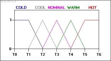 With this scheme, the input variable's state no longer jumps abruptly from one state to the next. Instead, as the temperature changes, it loses value in one membership function while gaining value in the next. In other words, its ranking in the category of cold decreases as it becomes more highly ranked in the warmer category.