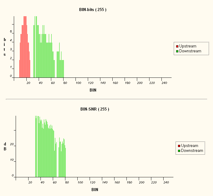 Below are examples of how the bin layout may look on various ADSL modems. Both show similar information and in each example there are 256 bins with a varied number of bits being encoded on each one. We can see that at around the frequency range of bin 33, the SNR is 40 dB with the bits per bin being around 6 or 7.