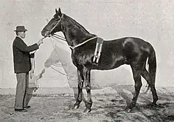 Galliard stood as a breeding stallion in England before moving to France, and later to Germany in 1895.[22] His offspring included Gulliver (Richmond Stakes, Hardwicke Stakes), Beowulf (Bayerisches Zuchtrennen), Griffin (Mehl-Mülhens-Rennen), War Dance (Prix de Meautry) and Black Duchess (dam of Bay Ronald). War Dance sired Perth who won the Prix du Jockey Club and the Grand Prix de Paris before becoming the Leading sire in France on three occasions.[23] Galliard was euthanized in Germany in 1903.[22]