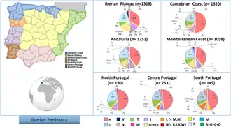 - ^ Barral-Arca R, Pischedda S, Gómez-Carballa A, Pastoriza A, Mosquera-Miguel A, López-Soto M, et al. (2016). "Meta-Analysis of Mitochondrial DNA Variation in the Iberian Peninsula". PLOS ONE. 11 (7): e0159735. Bibcode:2016PLoSO..1159735B. doi:10.1371/journal.pone.0159735. PMC 4956223. PMID 27441366.