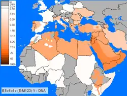 This haplogroup reaches a mean frequency of 85% in North Africa. It decreases in frequency from approximately 80% or more in some Moroccan Berber populations, including Saharawis, to approximately 28% to the east of this range in Egypt.[29][35][37]