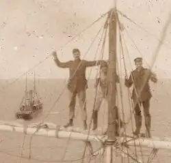 Buckley (left) with Jameson Adams and Alistair Mackay in the rigging of the Nimrod; Koonya in the background[1]
