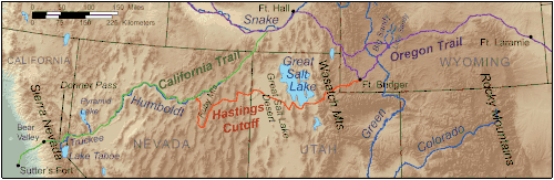 To promote his new route (the "Hastings Cutoff"), Lansford Hastings sent riders to deliver letters to traveling migrants. On July 12, the Reeds and Donners were given one.[29] Hastings warned the migrants they could expect opposition from the Mexican authorities in California and advised them to band together in large groups. He also claimed to have "worked out a new and better road to California" and said he would be waiting at Fort Bridger to guide the migrants along the new cutoff.[30]