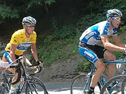 Hincapie has several important wins of his own, starting with Gent–Wevelgem in 2001 and Kuurne–Brussels–Kuurne in 2005. Also in 2005, Hincapie took two stage wins at the Critérium du Dauphiné and 2nd place at Paris–Roubaix. In 2005 he had his first stage win in the Tour de France where, on July 17, he finished seven seconds ahead of climber Óscar Pereiro to win Stage 15 from Lézat-sur-Lèze to Pla d'Adet. In January 2014, Pereiro acknowledged in a radio show that during the final climb, Hincapie turned his head and said 50,000, which Pereiro assumed was in Euros, although Hincapie was referring to U.S. dollars. Pereiro accepted the offer and sold the stage to Hincapie.[7] The deal was closed some kilometers before arriving to the finish line.[8] More recent victories include two stages at the Tour of California (2006), the overall and a stage at the Tour of Missouri (2007), and another stage win at the Critérium du Dauphiné in 2008. He is a three-time US Professional Road Race champion (1998, 2006, 2009).