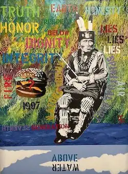 Longfish's As Above So Below portrays a black-and-white painted Pawnee chief sitting next to a cheeseburger. The background features bright colors with words such as truth, honor, earth, respect, below, honesty, lies, air, reincarnation, and fire. The painting also has the year 1997 written on it and the word water flipped upside down. That year Brazil became the world's biggest export of beef for fast-food. Therefore, people would destroy nature just to export fast food products. In addition, the words on the painting, such as the upside-down water, also symbolize how Indigenous values have been flipped upside down due to colonization. From what the viewer can see, Longfish paints this painting to try to express how he had to forget many of his cultural beliefs as he grew up and how they should not be forgotten.[5]