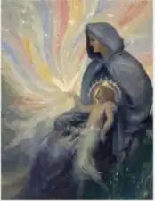 He claimed to see nature spirits and made paintings about them, such as the sídhe, elven or faerie beings in Irish folklore.[19][20] On one occasion, he showed some drawings he had made of them to a peasant, who would have pointed out that he had already seen many of those entities.[20] In 1889 he had traveled with W. B. Yeats to a town in County Galway, where Russell also painted these spirit beings, and a Druid is said to have appeared to them in vision.[21] The previous year, in a letter to Yeats, Russell had stated: