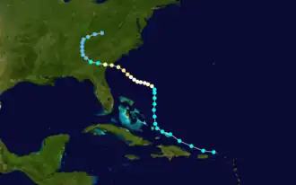 The storm moved moving west-northwest near the Mona Passage, bringing squalls of 44 miles per hour (71 km/h) to San Juan, Puerto Rico. On August 6, the developing storm was near the southeastern Bahamas, bringing moderate to rough seas. The cyclone turned northward after its close approach to the southeastern Bahamas. By August 10 a ship reported that winds were hurricane force. In the afternoon of August 11, the hurricane made landfall near Beaufort, South Carolina where it moved inland and turned just northeast of Savannah, Georgia between 5 and 6 p.m. on the same day. Savannah's wind peaked at 73 miles per hour (117 km/h) and the pressure fell to 28.78 inches of mercury (975 hPa). It was the area's worst storm in 29 years.[3] Hurricane-force winds were witnessed between Savannah and Charleston. Weakening into a tropical storm that evening, for the next four or five days the storm meandered inland as a weak tropical storm before evolving into an extratropical cyclone on the evening of August 14.[2]
