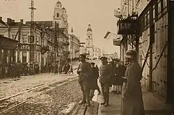 On the Russian-German front, the war began with battles in East Prussia, Poland, and Galicia. The Lithuanian-Belarusian provinces located near the theater of military operations were declared under martial law. Strikes, meetings, processions, demonstrations were prohibited, military censorship was introduced. The territory of Belarus turned out to be part of the Dvinsky and Minsk military districts, and in accordance with the decree of Nicholas II of July 20, 1914, the entire local civil administration had to obey their superiors.[2] The Headquarters of the Supreme Commander-in-Chief, Grand Duke Nikolai Nikolaevich, was located in Baranovichi. On July 29, by his order, a directive was sent to the chiefs of military districts "to render the most energetic assistance to the civil authorities by military force, in order to eliminate any attempt at unrest at once with the full unity of the military and civilian authorities on the ground."[3]