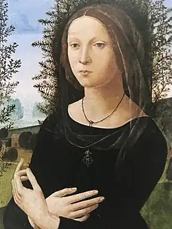 Ginevra was born into a family of wealthy Florentine merchants in 1457. The Benci had business dealings with the Medici and were noted humanists themselves, patronizing artists and writers and creating an important library of classical texts.[1] In 1474 she married Luigi de Bernardo Niccolini.[2] Bernardo Bembo, Lorenzo de' Medici, Alessandro Braccesi, and Christoforo Landino dedicated poems to her.[3]