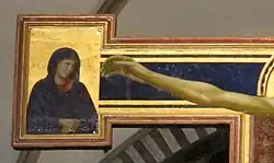 The two mourners at the ends of the arms of the cross are depicted from the side, rather than from the front, as in Cimabue's Santa Croce Crucifix, fifteen years earlier. They are more volumetric due to their pose, the swelling of the drapery and the attention paid to the origin of the only source of light.