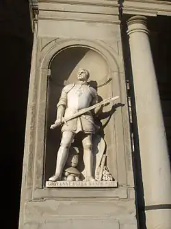 From an early age, he demonstrated great interest and ability in physical activity, especially the martial arts of the age, such as horse riding and sword fighting. He committed his first murder at the age of 12, and was twice banished from the city of Florence for his unruly behaviour, including involvement in the rape of a sixteen-year-old boy, Giovanni being about thirteen at the time.[1] He had a son, Cosimo (1519–1574), who went on to become the Grand Duke of Tuscany.
