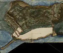 By the end of February the Spanish had brought forward siege works, but were exposed to fire from the British defenses and also from above, since small mines exploded at the top of the Rock sent showers of stone into the Spanish trenches.[17] By mid-March the North Bastion was suffering from heavy fire from a 12-gun position close to the Rock.[18] At the end of April the bastion was still subject to heavy fire from the Spanish batteries, with three guns dismounted on the 30th.[19] In the end, it proved impossible for the Spanish to break through the fortifications. On 23 June 1727 a truce was agreed, and a peace treaty was signed in 1729 after long negotiations.[20]