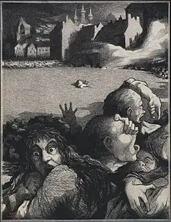 Combaz further designed book covers and postcards. Particularly well known are his postcards with designs of the four elements, scenes of the ocean and fishermen, expressions and proverbs. He further created a number of drawings that expressed the horror of the Belgians at the atrocities committed by the German occupiers during the First World War. One of his drawings called Louvain shows the terror of the citizens of Louvain at the burning down of their town by German soldiers on 25 August 1914. Combaz depicted in very graphic detail the horrified people fleeing the town with flames visible in the background of the drawing.[6]