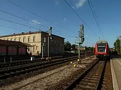 The station building, which dates from the building of the line, is to the west of the road to Havelberg and south of the tracks, on the side facing away from the town. It was probably designed by the planning director of the Berlin–Hamburg Railway, Friedrich Neuhaus together with Ferdinand Wilhelm Holz.[6] The basic design of the building is similar to Ludwigslust station and the original Boizenburg station building, which no longer exists.[7] The two-story building with a flat hip roof has an L-shaped ground plan. The outer side facing north on the side of the tracks has six portals and the side facing east towards the federal highway has nine portals. This asymmetric plan differs significantly from most other station buildings on the Berlin–Hamburg railway.[4] The shape of the building, unlike some other stations of the Berlin–Hamburg railway, has not been altered by later additions with the exception of a loggia[6] attached to the inside of the courtyard after 1859. Living quarters were established in the longer wing of the building and the waiting rooms among other things were located in the shorter wing.[4]