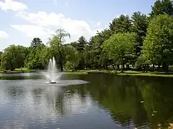 In 1766 it was renamed Wing's Falls for Abraham Wing – the leader of the group of Quakers who established the permanent settlement – and for the falls on the Hudson River. Wing's claim to the name of the falls and the hamlet was transferred to Colonel Johannes Glen of Schenectady in 1788, either on collection of a debt, as a result of a game of cards, or in exchange for hosting a party for mutual friends, depending on which local legend is believed.[5][6][7] Colonel Glen changed the name to "Glen's Falls," though it was often printed with varying spelling such as "Glenn's," "Glenville",[8] or "Glens". The spelling "Glens Falls" came to be the common usage.[5]