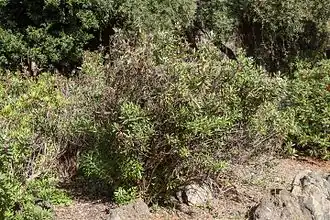 It is a small procumbent shrublet resembling G. sarcophylla but with larger broadly lanceolate leaves (5–10 cm), short peduncles (1–2 cm) and pale blue white flowers.