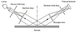 A typical glossmeter consists of a fixed mechanical assembly comprising a standardised light source that projects a parallel beam of light onto the test surface to be measured and a filtered detector located to receive the rays reflected from the surface. The ASTM Method states that the illumination should be defined such that the source-detector combination is spectrally corrected to give the CIE luminous efficiency, V(?), with CIE illuminant SC.[4]