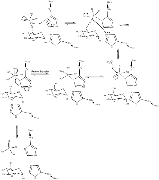 The hydrolysis of glucose 6-phosphate begins with a nucleophilic attack on the sugar-bound phosphate by His176 resulting in the formation of a phosphohistidine bond and the degradation of a carbonyl. A Negatively charged oxygen then transfers its electrons reforming a carbonyl and breaking its bond with glucose. The negatively charged glucose-bound oxygen is then protonated by His119 forming a free glucose. The phospho-intermediate produced by the reaction between His176 and the phosphate group is then broken by a hydrophilic attack; after the addition of another hydroxide and the decomposition of a carbonyl, the carbonyl is reformed kicking off the electrons originally donated by the His176 residue thereby creating a free phosphate group and completing the hydrolysis.[9]