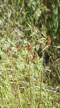 American licorice is grazed by cattle, but not preferred and will increase under grazing as competing plants are grazed off. The new growth can be toxic.[9] It has light green to white flowers in the spring which ripen in the fall to clusters of burs which contain pods of small bean-like seeds.