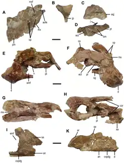 Additionally, a unique combination is present of traits that in themselves are not unique. The part of the dentary in front of the large outer side opening is horizontally elongated. The dentary lacks a lower branch at the front, contributing to the symphysis. A separate coronoid bone is present. On the thighbone the minor trochanter is separated from the major trochanter by a clear cleft.[1]