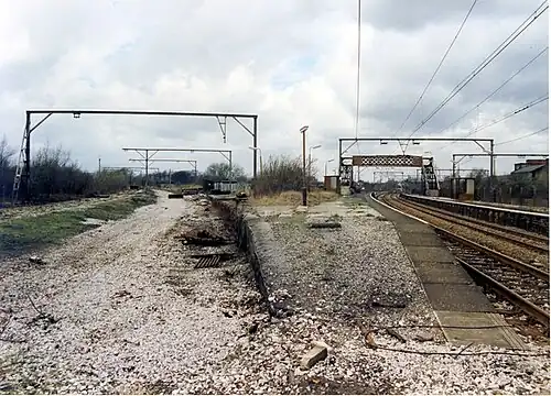 By the late 1970s, traffic had declined on the Woodhead line and the sidings at Godley had become overgrown.[7] Nearby, Manchester City Council erected high-rise housing estates which were served by a newly opened station at Hattersley.[7] On 20 July 1981, the connection to Woodley closed along with the Woodhead line between Hadfield and Penistone.[8] Track lifting followed in 1985–6.[9]
