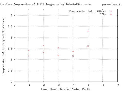 The Golomb–Rice coder is used in the entropy coding stage of Rice algorithm based lossless image codecs. One such experiment yields the compression ratio graph shown.