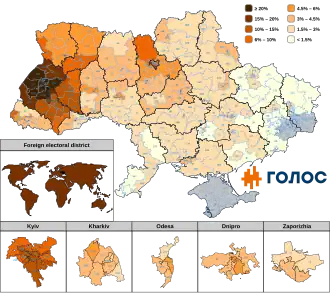 In the October 2020 Ukrainian local elections, Voice had some local success, having led its factions to the Lviv Oblast Council, to the city councils of Kyiv, Lviv, Cherkasy, and a number of other city councils, including even in the Donbas.[33] The party's mayoral candidate made it to the second round of the election in Cherkasy, which he lost.[33][34]
